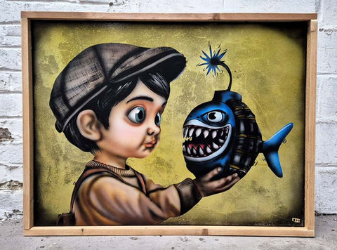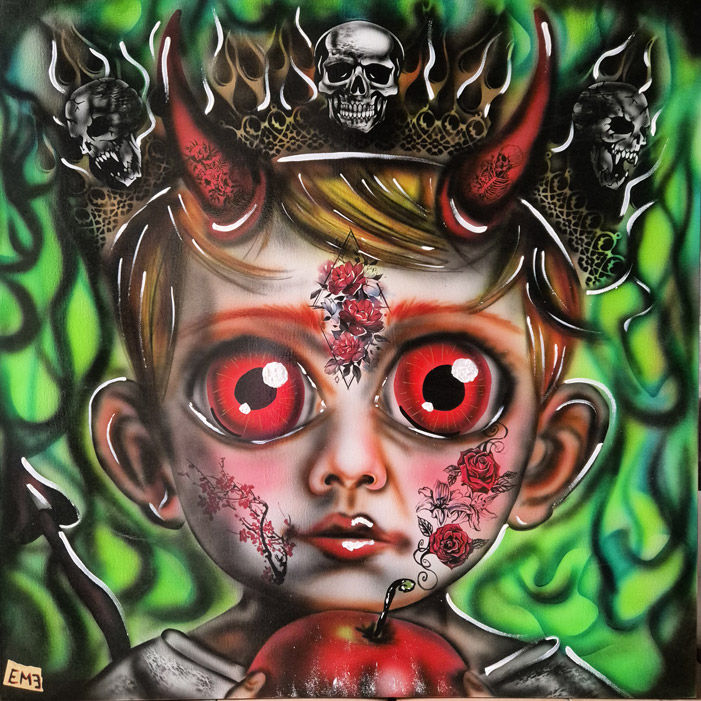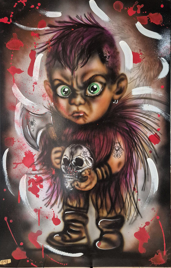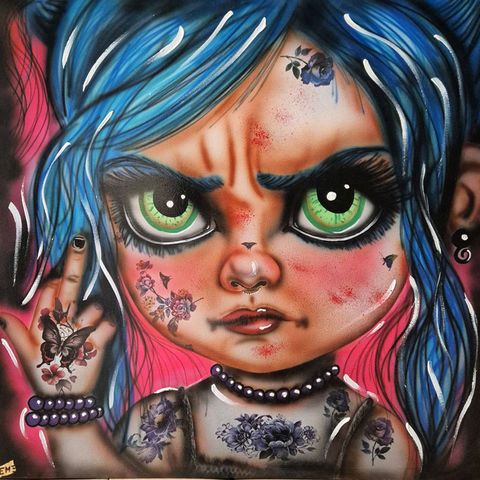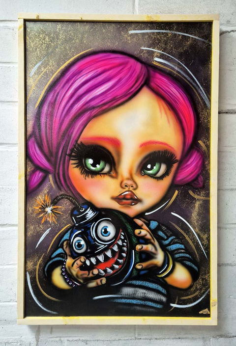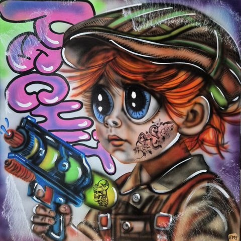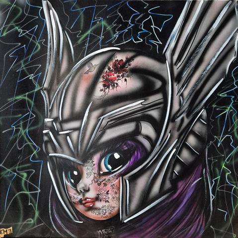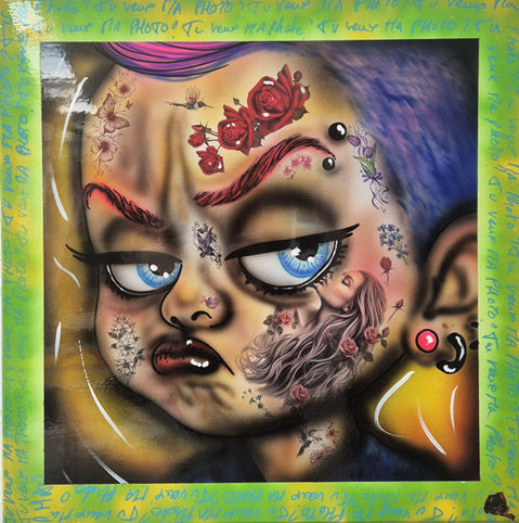 Tableau de dimensions 1mx1m - Œuvre unique. Les techniques utilisées sont les bombes, type graff. Pinceaux avec peintures acryliques et sans oublier l'aérographe ! Mon outil de prédilection et que j'affectionne particulièrement.